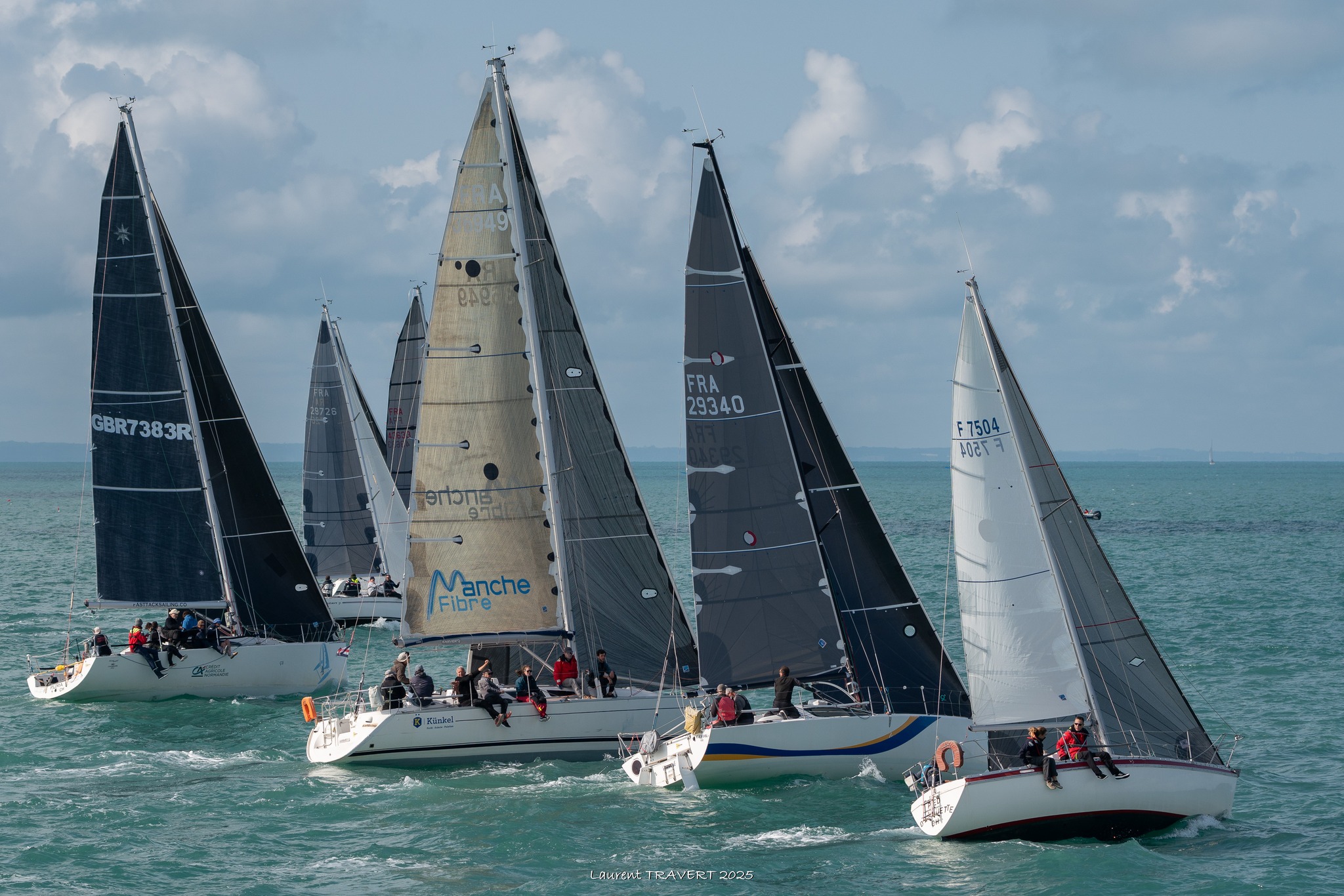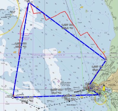 Le parcours : Départ sur la ligne du Club entre le Loup et la digue, Fourchie à tribord (1 mille de louvoyage), bouée no10 devant Donville, à bâbord (1,4 mille de spi à 75° du vent bâbord amures), bouée d’Anvers à bâbord (4,3 milles de louvoyage), bouée Videcoq à bâbord (4,3 milles de reaching un peu ouvert tribord amures), arrivée sur la ligne du Club (3,9 milles de spi presque vent arrière).