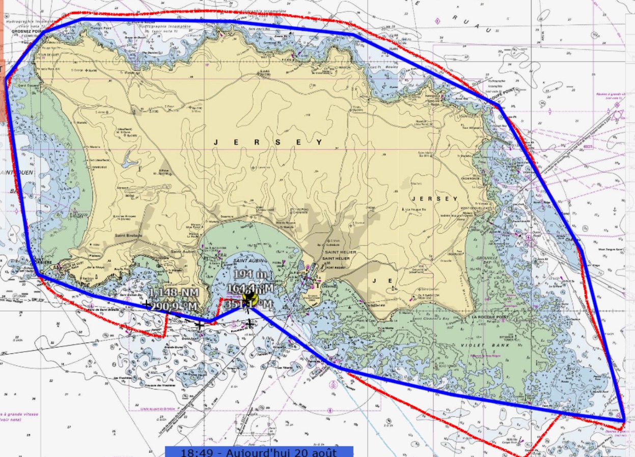 Le Parcours : Départ dans la partie ouest de la baie de St Aubin, entre le bateau Comité et une bouée, bouée La Baleine à tribord (bouée de dégagement à 500 m), bouée Diamond à bâbord (770 m à 120° du vent), tourelle Demie de Pas à bâbord (2 milles de près ouvert bâbord amures), bouée Violet à bâbord (6 milles de louvoyage), Jersey à bâbord (23 milles à un peu toutes les allures), bouées Passage Rock puis Les Fours à tribord, arrivée dans l’alignement des bouées Diamond et La Ruaudière (à bâbord) (4 milles de louvoyage).
