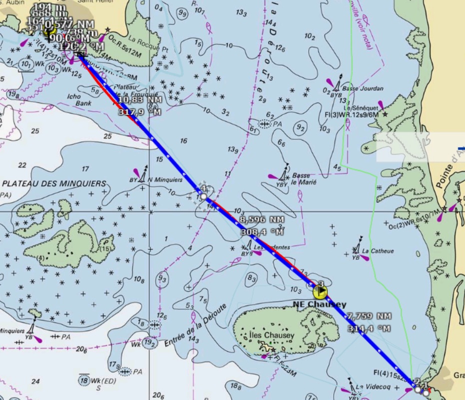 Les Ecrehous et les Dirouilles qui sont dans le vent cassent le clapot et diminuent le planing, ce qui est très bon pour nous. Nous nous écartons des Rapetous en restant proches de la côte et ne perdons rien sur eux.