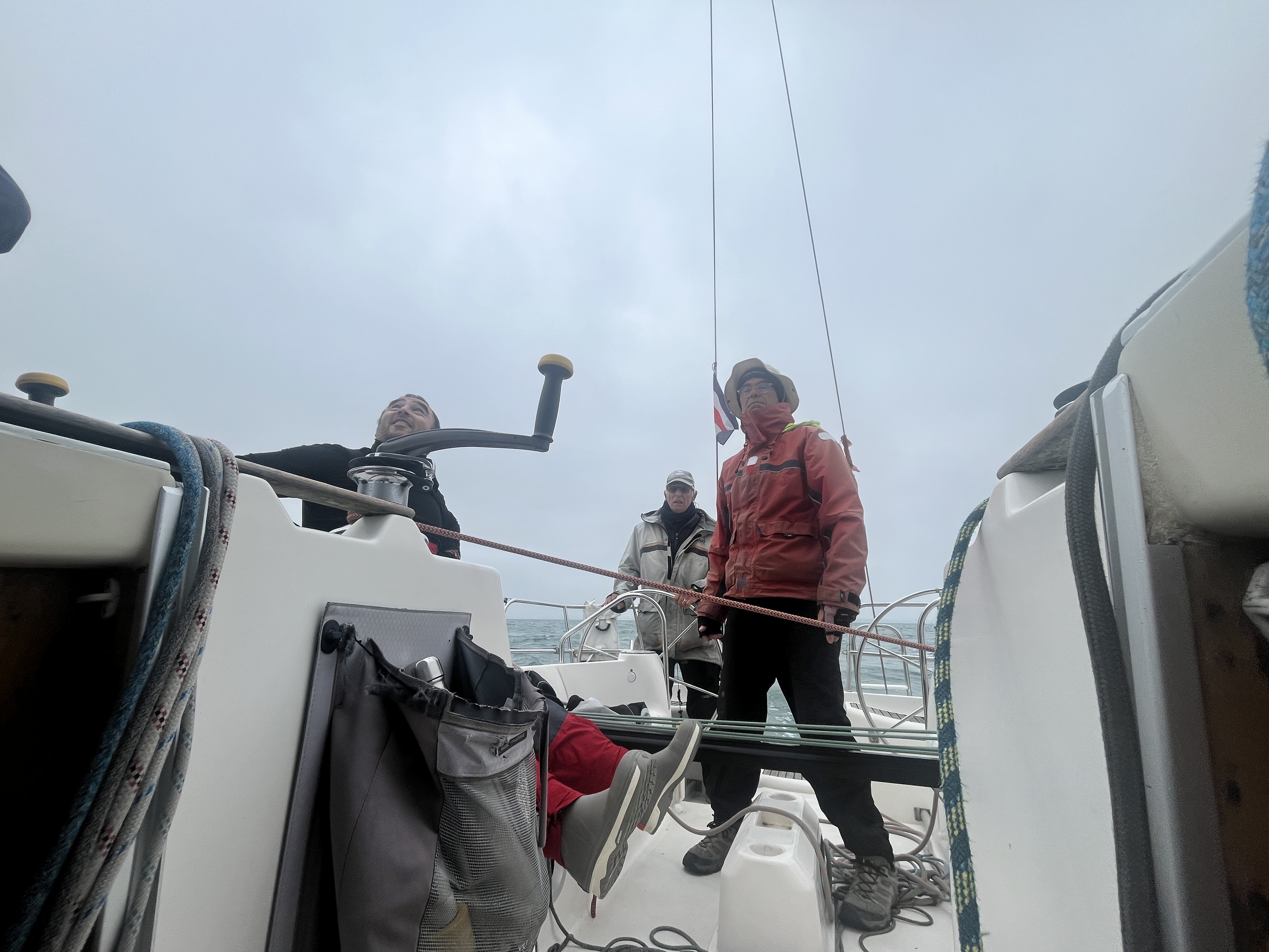 L’équipage : Pierre à l’avant, Stéphan au pied de mât, Harmony au piano, François et Damien à l’embraque, Philippe à la GV, Fabrice à la nav. et tactique et John à la barre.